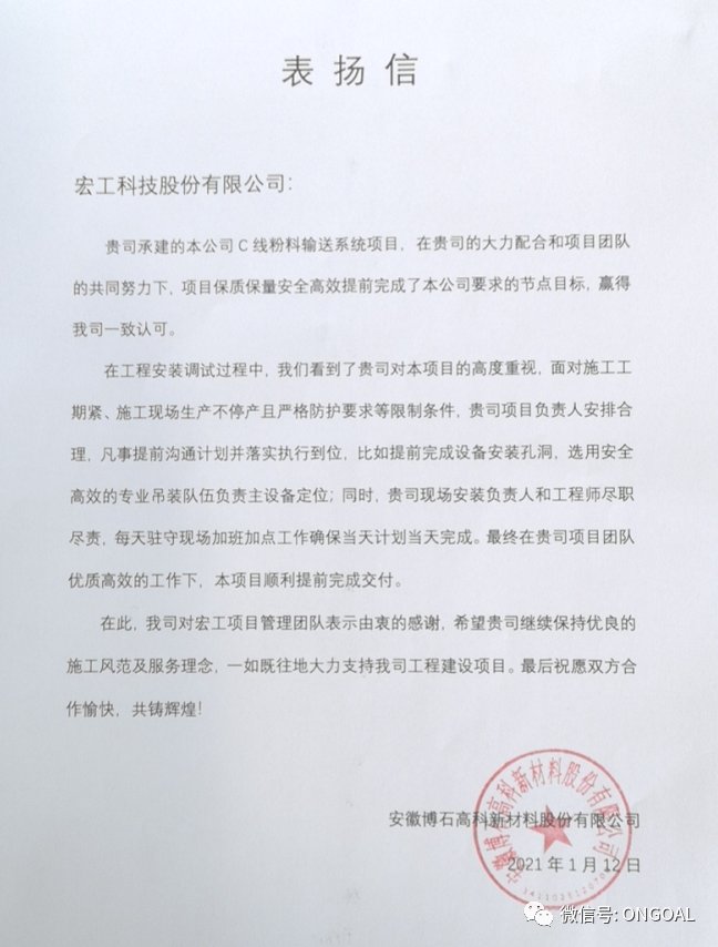临近春节之际,宏工科技的粉料输送项目迎来了服务客户的嘉奖。1月12日,安徽博石高科新材料股份有限公司(以下简称:博石高科)的C线粉料输送项目确认保质保量圆满完成,并得到了博石高科专门发函对宏工及项目施工管理团队提出表扬。该项目自承建以来,项目管理施工团队克服重重困难,在疫情肆虐当下,多次出色完成要求